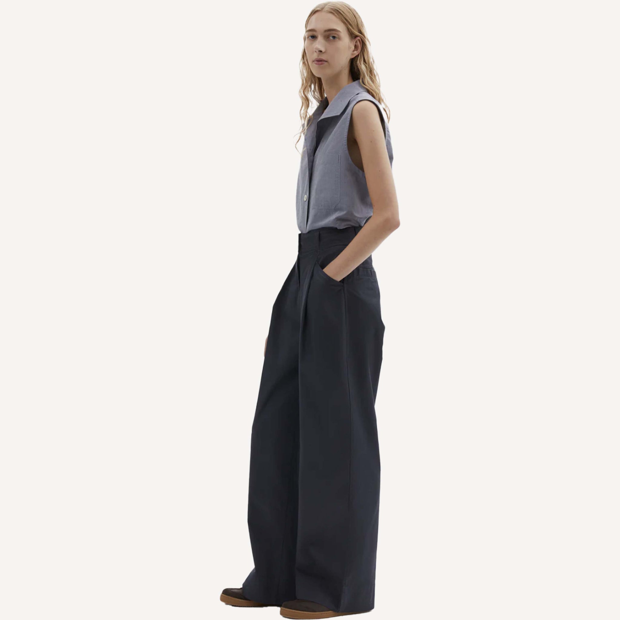 • High waisted with regular cut and wide leg